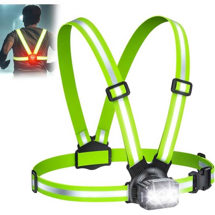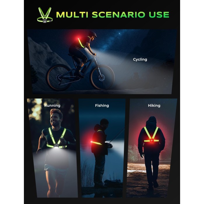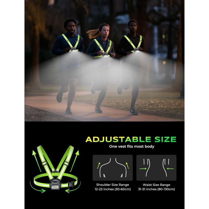- 【IPX4 Waterproof & Multi-Use】 Built to withstand rain, sweat, and splashes, the IPX4 waterproof rating ensures durability in various weather conditions. Whether running, cycling, hiking, walking the dog or other outdoor activities, this running reflective gear offers a more comfortable, flexible and convenient lighting solution than headlamps.