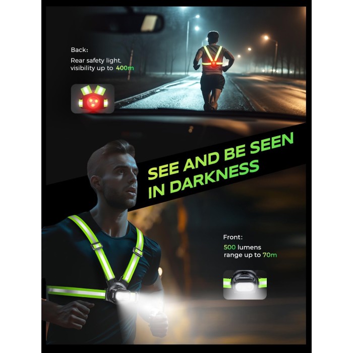 - 【360° Visibility at Night】 The 500-lumen front light illuminates your path up to 70 meters, while the rear light provides exceptional visibility from up to 400 meters away. For superior safety over traditional headlamps, this running lights for runners features 360° reflective straps, providing all-around visibility without the need to turn your head.