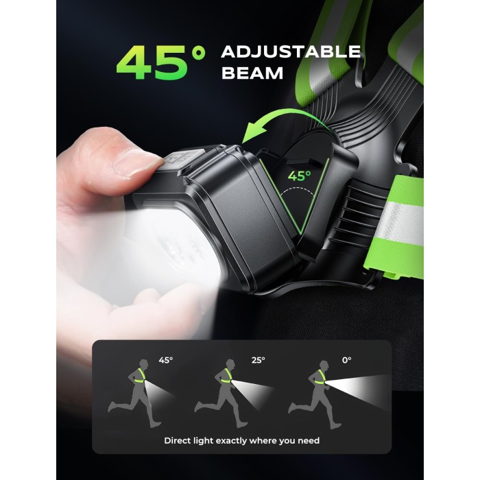 - 【Customizable Lighting】 Choose from 7 front light modes and 2 rear light modes, allowing you to switch between different colors and flashing patterns to grant you the freedom of choosing the perfect setting for any situation. Our reflective running gear with 45° adjustable beam angle lets you spotlight distant paths or illuminate nearby surroundings, giving you full control over your lighting.