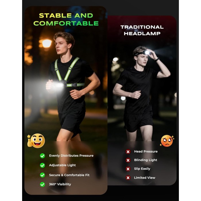 - 【Comfortable & Adjustable Fit】 Enjoy customized comfort with adjustable buckles and elastic straps accommodating shoulder widths of 12-23 inches (30-60cm) and waist sizes of 31-51 inches (80-130cm). This running light vest is designed wider dual-shoulder strap, which distribute weight evenly and enhances stability and comfort, perfectly resolving the head fatigue caused by traditional headlamps during long-distance running.